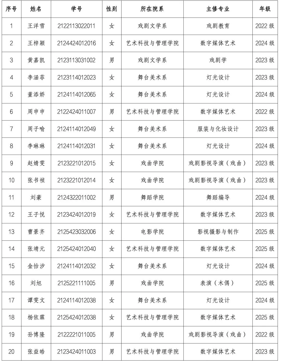 根据《上海戏剧学院微专业建设与管理办法(试行)》精神及学校教务处相关工作要求,经学生自愿报名,《Ai+机器人演艺》微专业教学组综合评审,教务处、艺术科技与管理学院审核,现将2026年《Ai+机器人演艺》微专业拟录取学生名单公示如下: