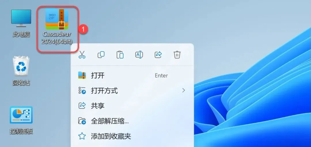 1.解压安装包:①鼠标右击【Cascadeur 2024(64bit)】压缩包②选择电脑上安装的解压软件(如:360压缩)③点击【解压到 Cascadeur 2024(64bit)】。
