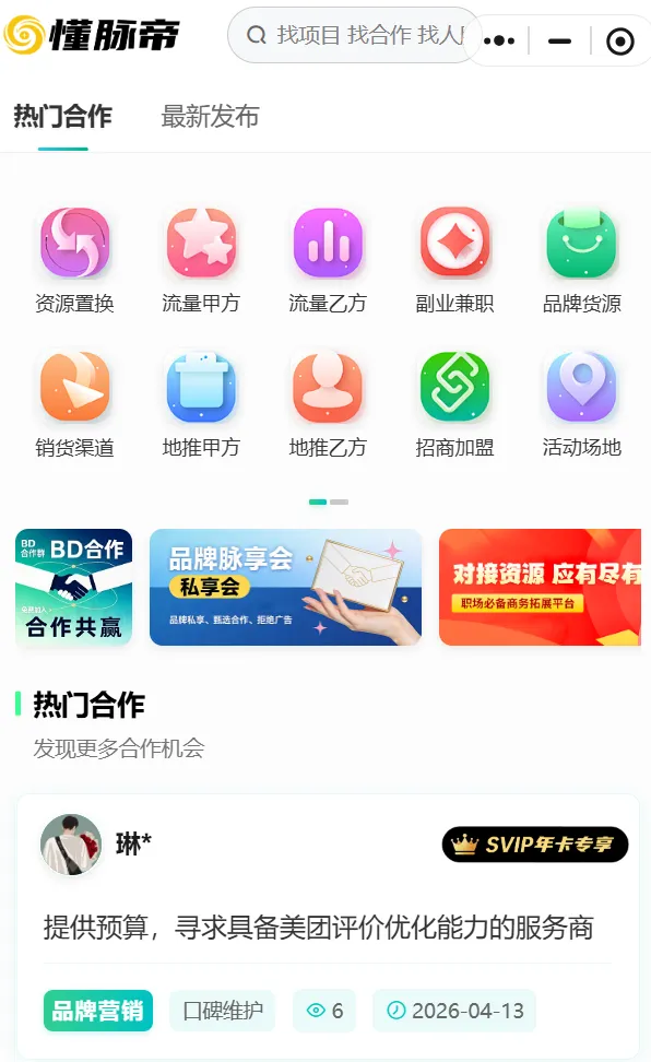 这也是为什么现在很多人不再单纯依赖搜索引擎找项目,而是会去一些资源对接平台上看真实需求。因为一个项目值不值得做,不仅要看官方怎么说,更要看市场上有没有真实合作机会。比如有些人在懂脉帝这样的平台上,不是直接找某个支付项目的客服电话,而是先看有没有品牌方、服务商、渠道方在发相关合作需求,看看行业里真实在对接什么、谁在找代理、谁在找地推团队、谁在找支付场景资源。这种方式的好处在于,你看到的不只是一个项目介绍,而是一个更接近市场真实温度的合作生态。