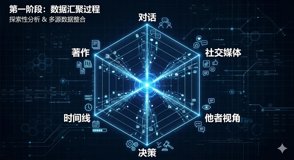 输入名字后,系统同时启动6个维度的agent:著作与系统性思考、长对话与即兴思考、表达DNA和碎片化风格、他者视角与批评、决策记录与行动、人物时间线。每个agent从40多个一手来源收集信息,还会自动发现人物身上的矛盾点。