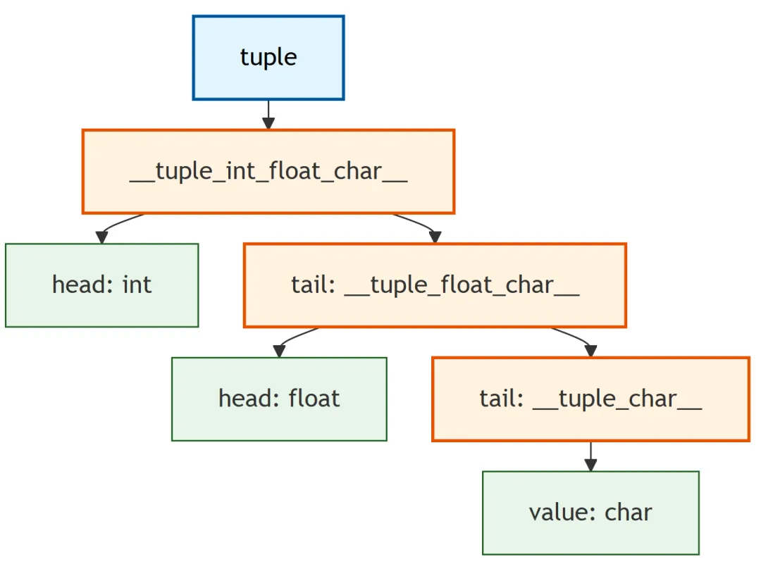 当用户书写 tuple<int, float, char> 时,引擎执行以下步骤: