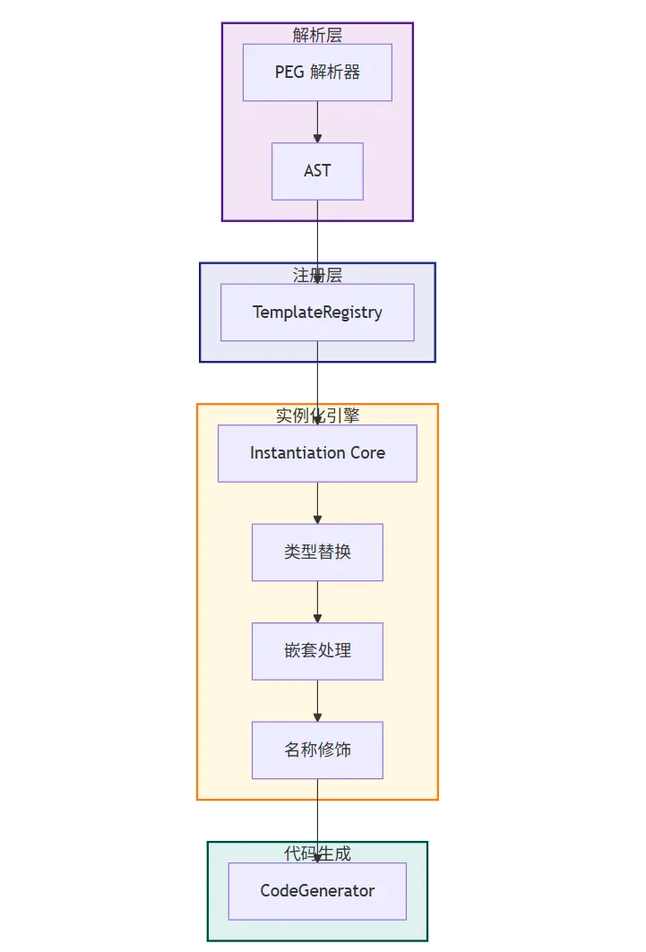 基于 rust-peg 的 PEG 解析器识别 template<>、typename、... 等记号,构建包含 TemplateDeclaration、TemplateSpecialization 节点的 AST。PEG 的有序选择特性被用于区分模板函数调用与普通函数调用。