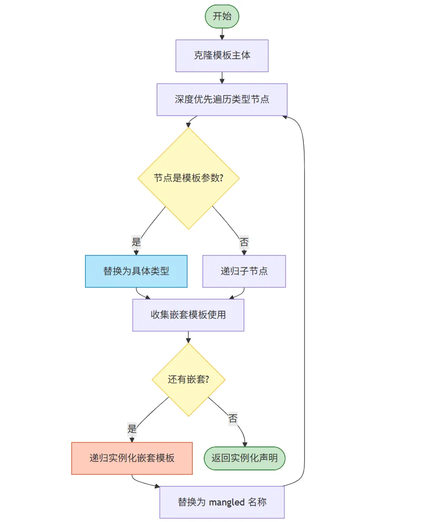• 根据使用点( TemplateTypeUse或TemplateFunctionCall)计算 mangled 名称。• 查找是否已实例化(缓存命中则跳过)。 • 选择通用模板或匹配的特化。 • 克隆模板主体,建立类型替换映射( T -> int)。• 递归实例化所有嵌套模板使用。 • 替换所有类型引用为 mangled 名称。 • 返回实例化后的声明列表。