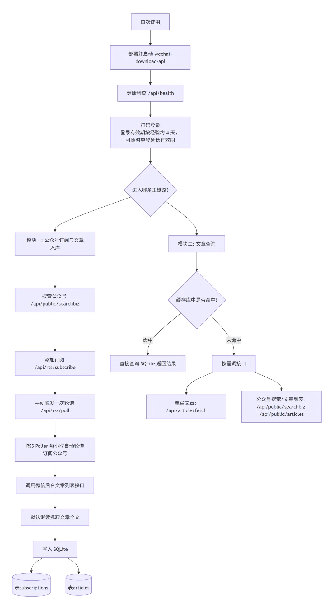 告诉 Agent “帮我订阅公众号 XX”,它会先搜索公众号,然后添加订阅,并立即手动触发一次轮询(初始拉取最近10篇文章并入库)。对于添加订阅的公众号,后台会定时拉取新增的文章,并进行解析、缓存至数据库里。