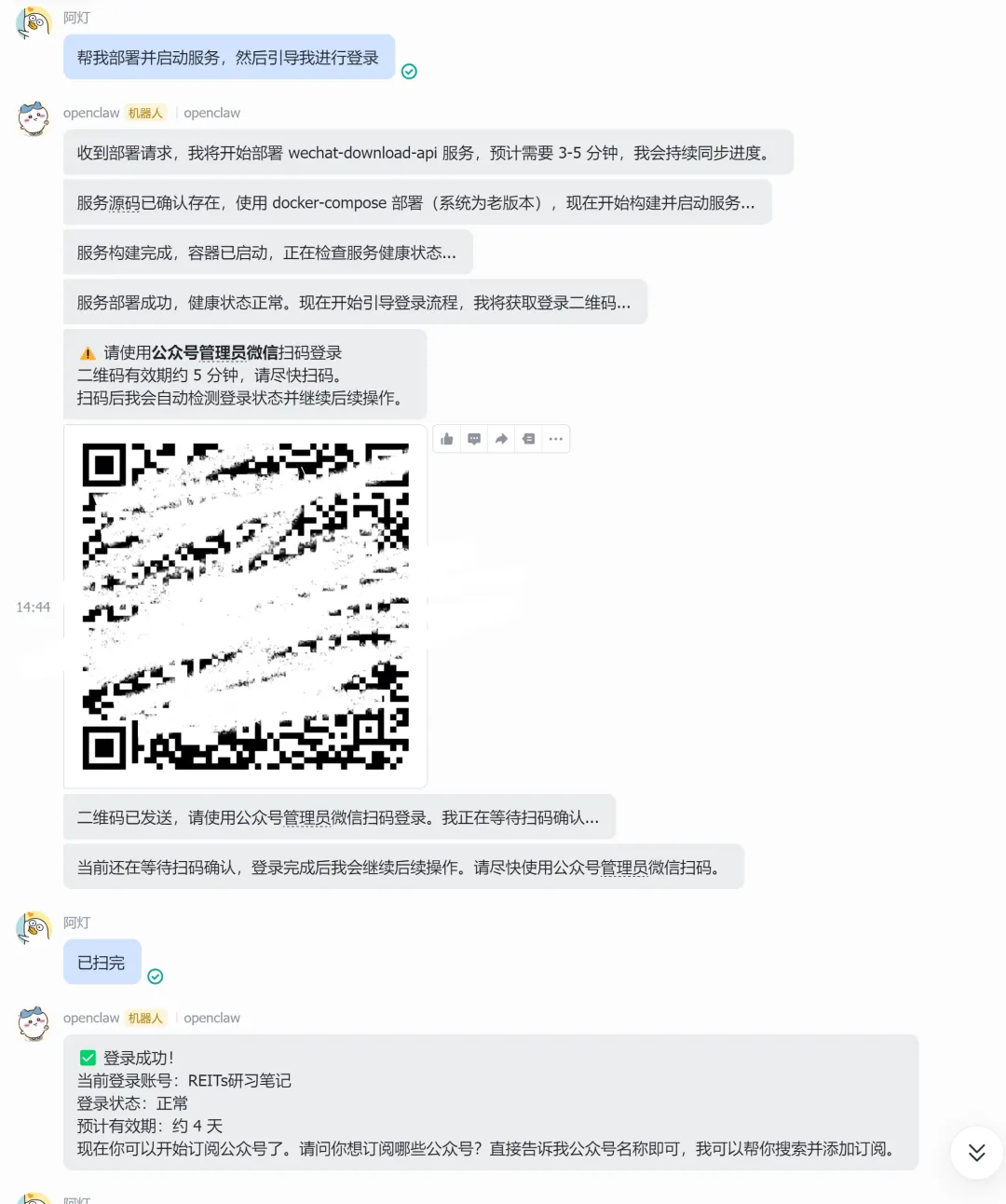 第一次使用,和Agent 说“帮我部署并启动服务,然后引导我进行登录”,Agent 会自动检查 Docker、拉起服务、生成二维码,并提醒你使用公众号管理员微信扫码,最后告知登录成功。