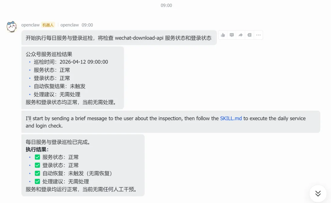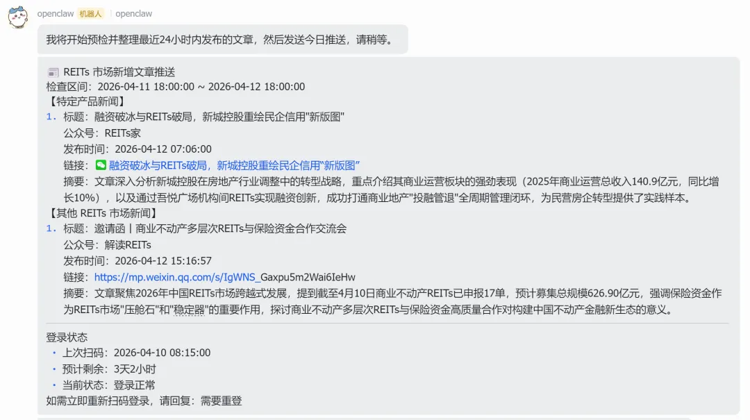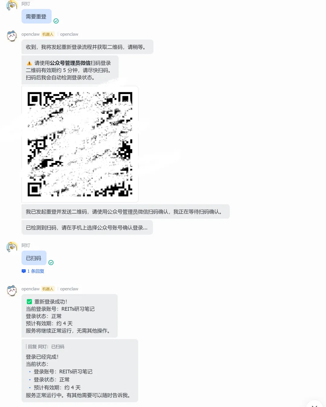 登录有效期大约 4 天。你可以随时对 Agent 说 “重新登录” 或 “重登”,它会立刻发起新的扫码流程,不影响正在运行的后台轮询。(你可以随时询问 Agent “登录状态还有多久到期”或者说“检查服务状态”以了解登录剩余时效,此外,每日定时巡检和定时文章推送时也会提醒你登录还有多久失效)