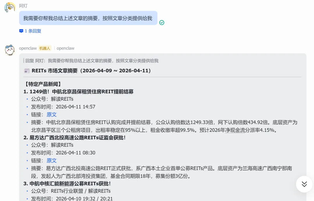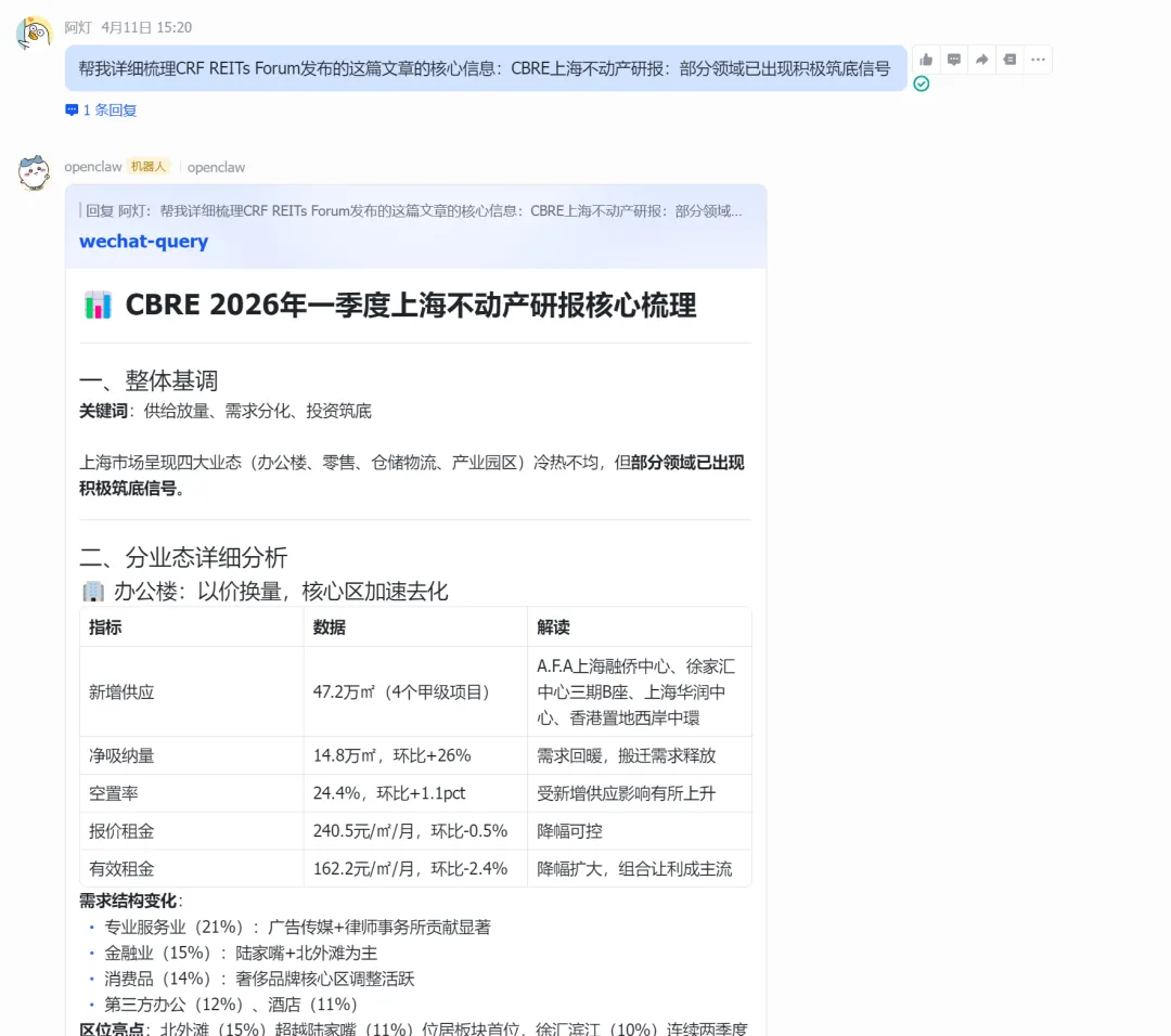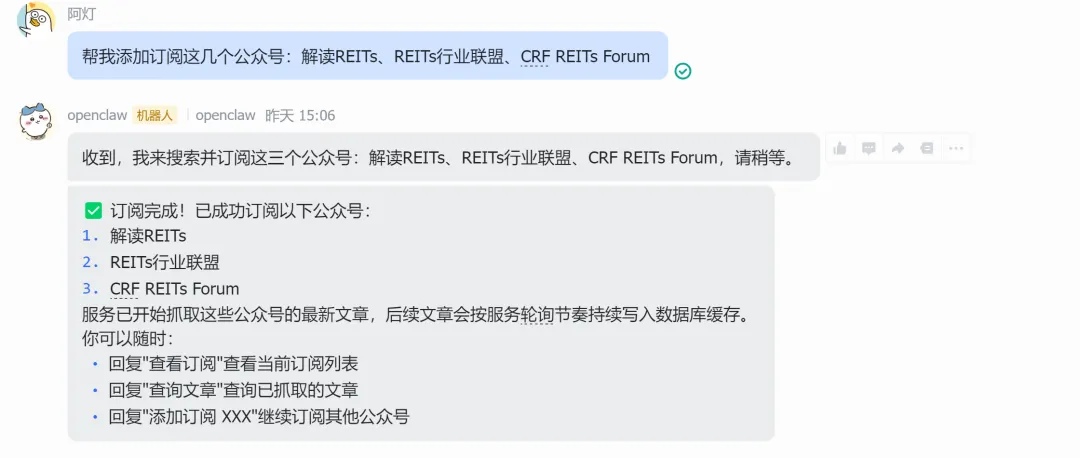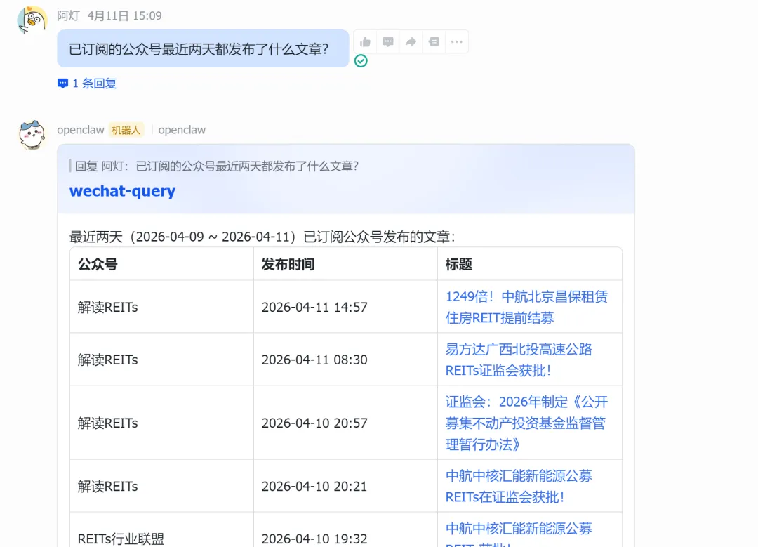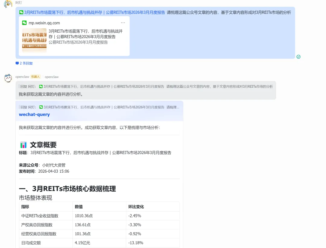 即使你从未订阅过某个公众号,只要把文章链接发给 Agent,它也能读取全文并回答你的问题。完成分析后,你可以让 Agent 订阅该公众号。