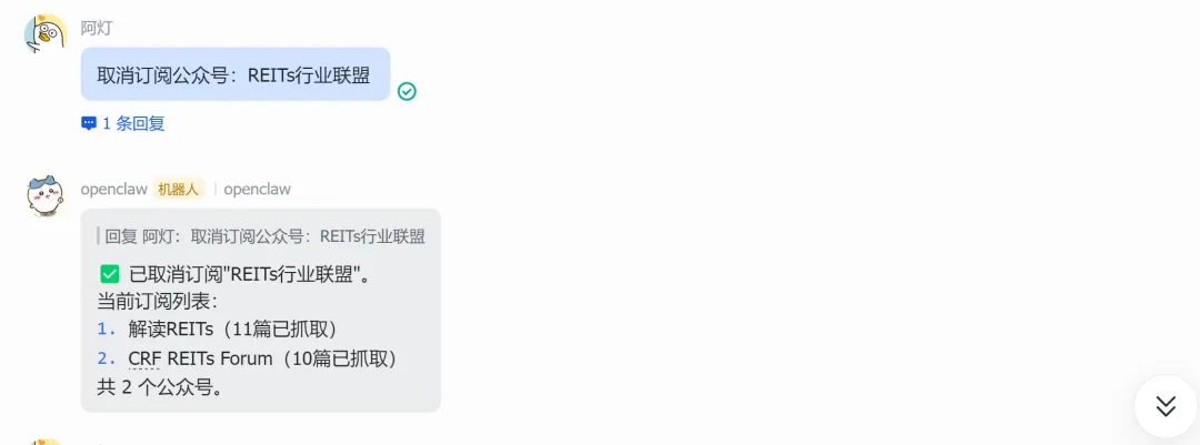 说 “取消订阅 XX 公众号” 即可取消订阅某个公众号,对应公众号的缓存文章也会一并删除。