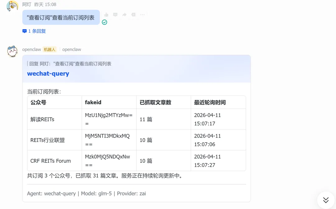 输入 “查看当前订阅了哪些公众号”,Agent 会返回订阅列表。