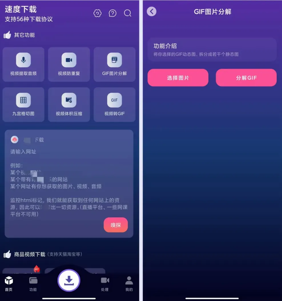 除了前面说的那些厉害功能,它还有好多超实用的小工具呢!就好比能把视频里的音频单独提取出来,能帮视频“变身”防重复,能把GIF图片拆成一张张小图,还能把图片切成九宫格样式,也能给视频“瘦身”减小体积,甚至能把视频转成GIF动图。这些小工具用起来简单得不得了,点一下,选好文件就能操作,完全没难度!