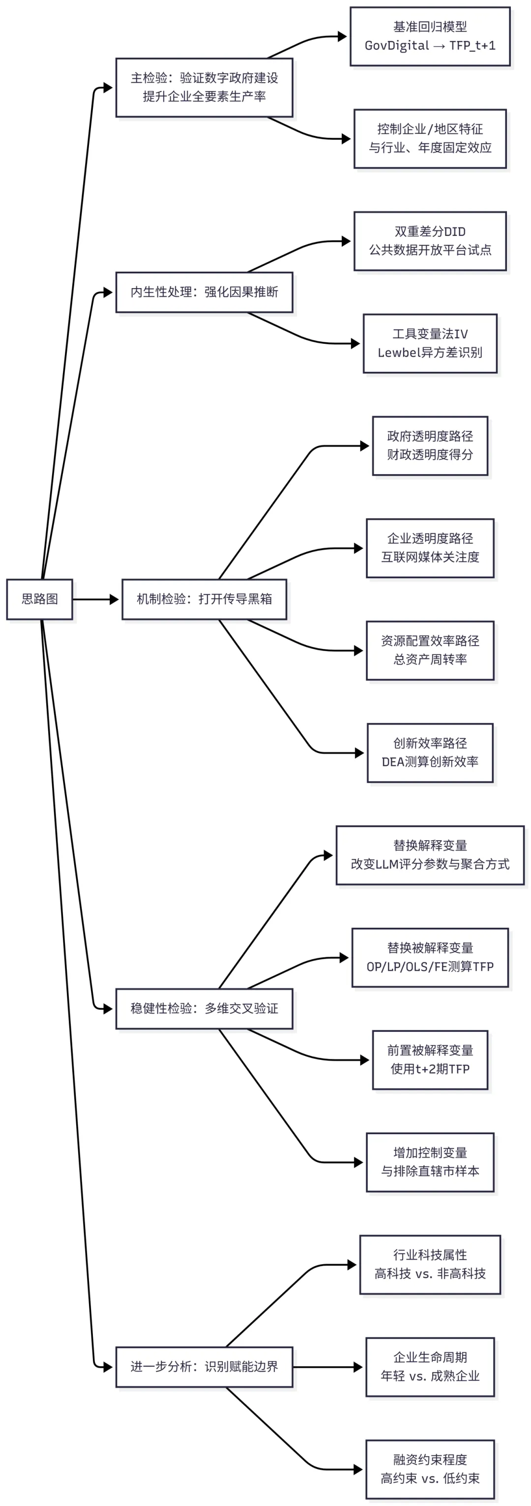 机制揭示:系统梳理并检验了数字政府从外部信息环境(政府/企业透明度)和内部生产经营效率(资源配置/创新效率)两条脉络、四条具体路径影响微观企业全要素生产率的“机制黑箱”。