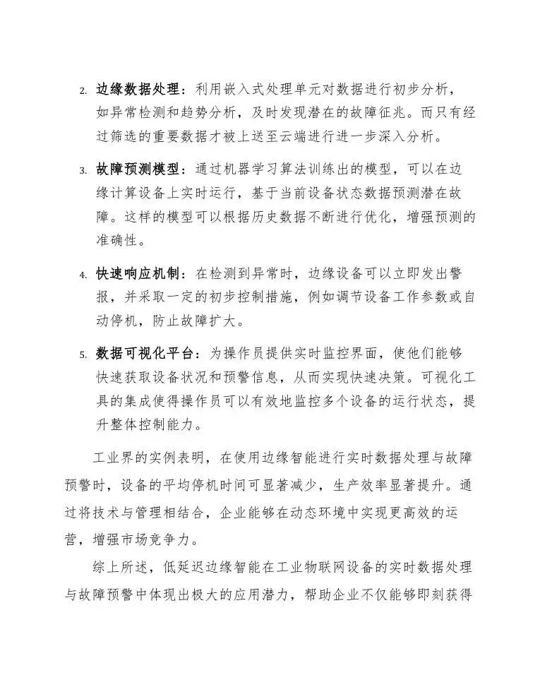 快速响应机制:在检测到异常时,边缘设备可以立即发出警报,并采取一定的初步控制措施,例如调节设备工作参数或自动停机,防止故障扩大。