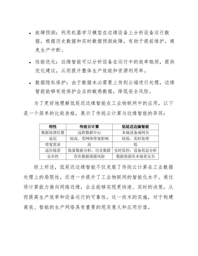 综上所述,低延迟边缘智能不仅克服了传统云计算在工业数据处理上的局限性,还进一步提升了工业物联网的智能化水平。通过将计算能力推向网络边缘,企业能够实现更快速、实时的决策,从而提高生产效率和设备运行的可靠性。这一技术的实施,对于构建高效、智能的生产网络具有重要的现实意义和应用价值。