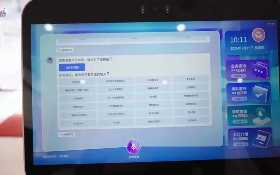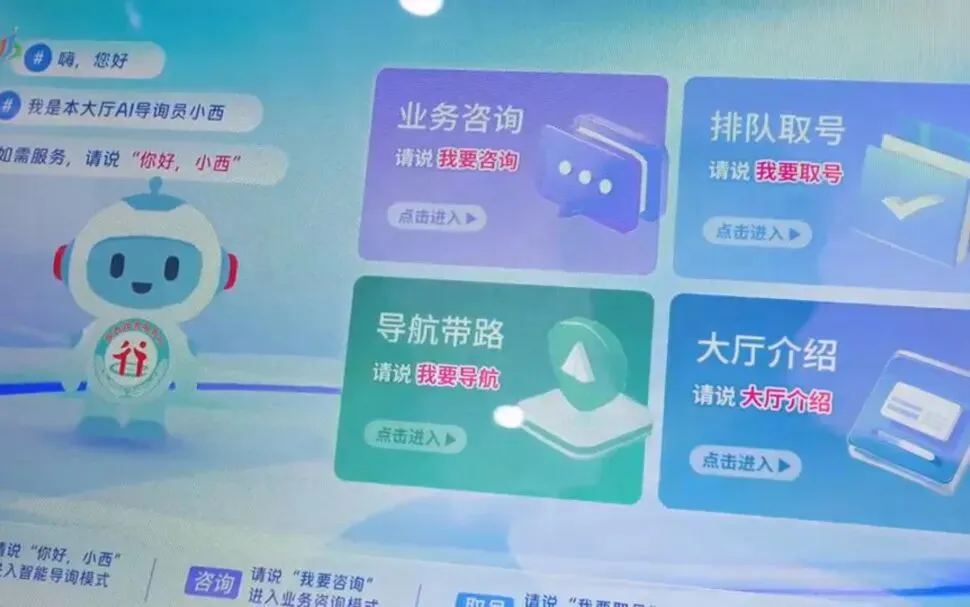 AI机器人“小西”具备业务咨询、智能导办、排队取号、大厅导航等功能,能精准识别语音指令,为办事群众提供“一对一”智能服务,有效填补线下服务的人力空白。