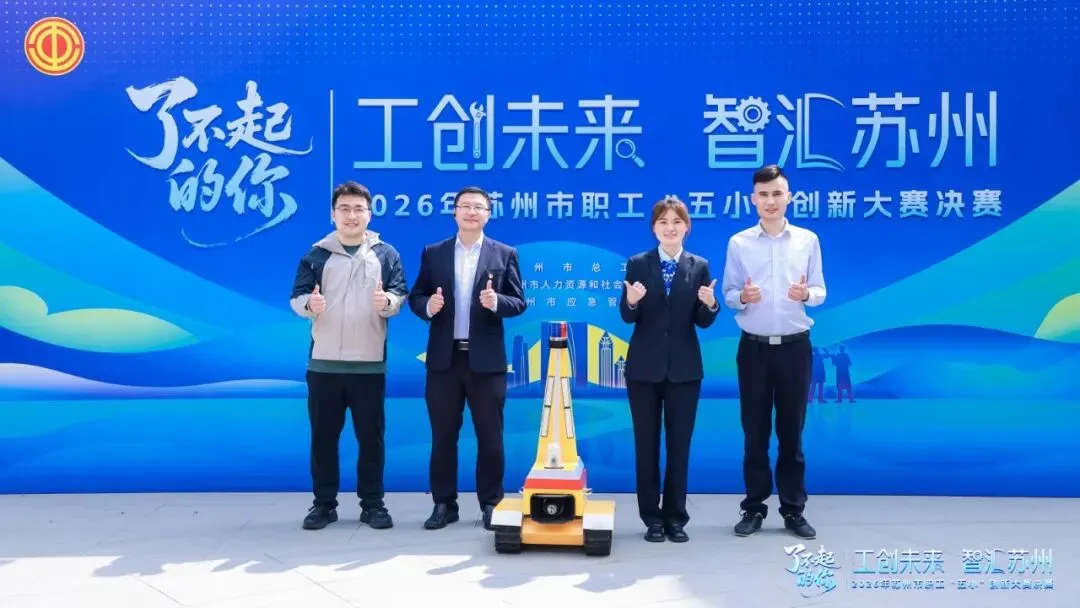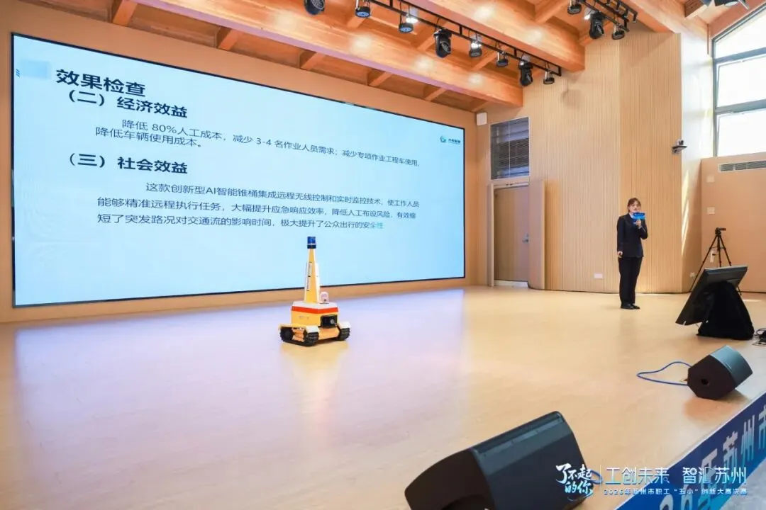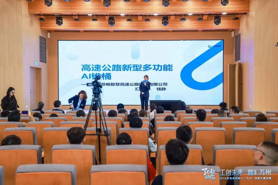 近日,由苏州市总工会主办的2026年苏州市职工“五小”创新大赛决赛在苏州市工人文化宫隆重举行。经苏州交投集团指导、推荐,苏州苏畅智慧高速公路建设有限公司携其自主研发的“高速公路新型多功能AI锥桶”精彩亮相,凭借卓越的创新性、实用性和显著的社会效益,赢得了现场评委与业界同仁的高度关注。