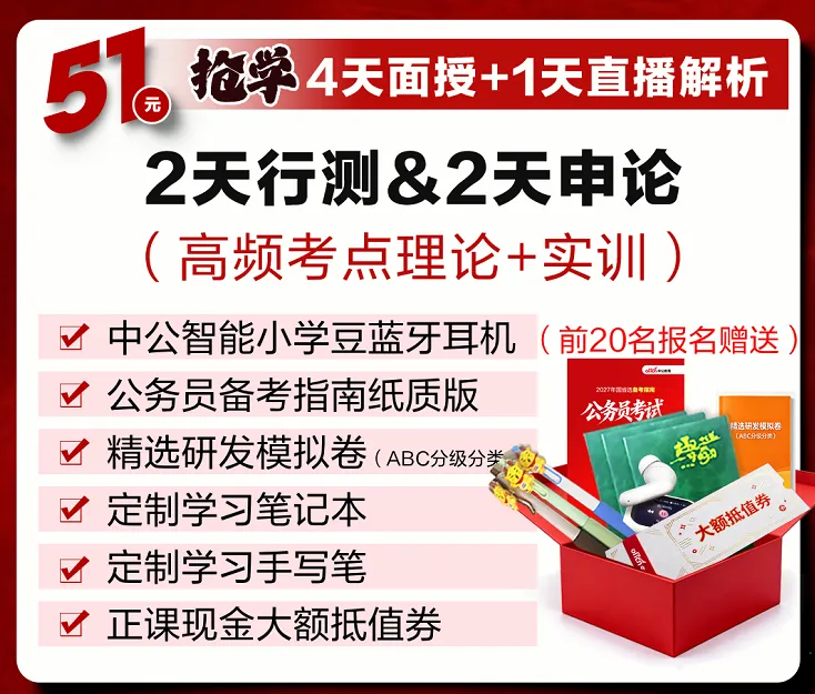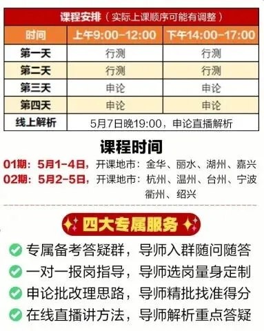课程内容:行测 + 申论,高频考点理论 + 实训地市可自选:2天行测 + 2天申论