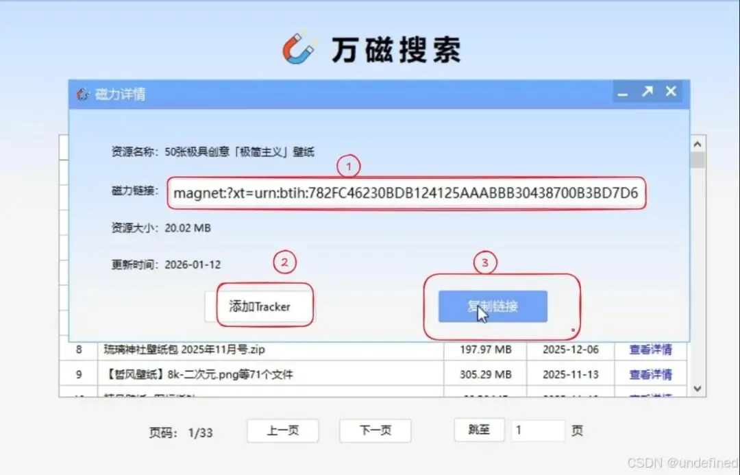 3.获取链接:选中资源 → 点击 查看详情 → 复制链接(可先点添加 Tracker加速)。