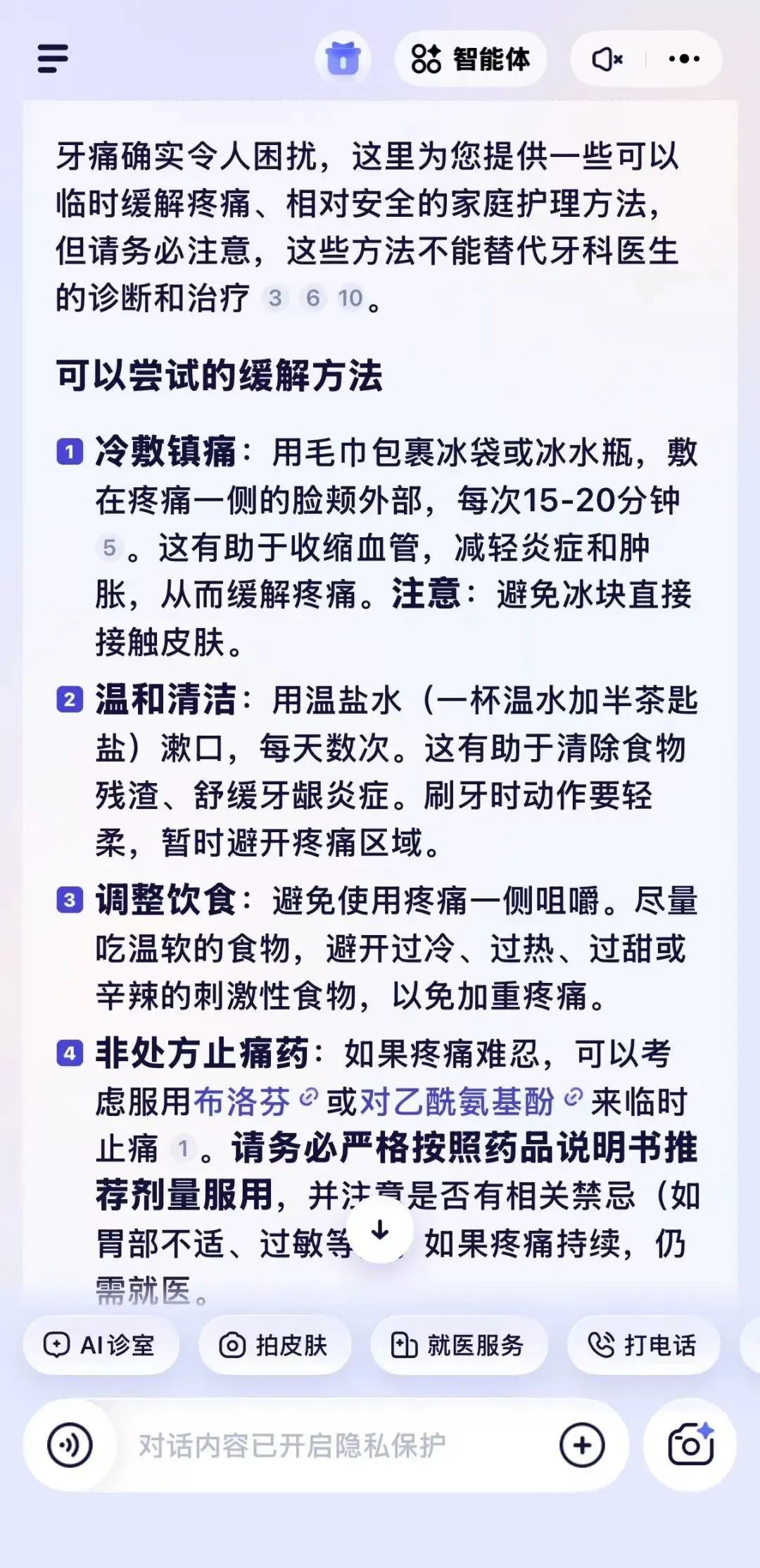 土土从诊所出来后,打开蚂蚁阿福和DeepSeek,输入了自己的情况。阿福给出了临时缓解的方法:先消炎、用温盐水频繁漱口、避免用患侧咀嚼,实在疼痛难忍可考虑用布洛芬止疼。同时阿福也明确告诉他:这些方法只能短暂帮你控制住局面,还是得尽快找牙医处理。