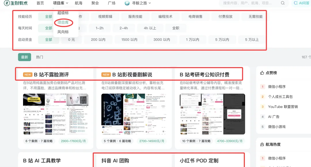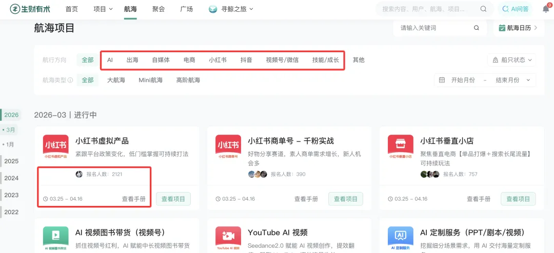 航海实战:这是重头戏。每月有各种实操项目(小红书、AI编程、出海、视频号等),报名需交199元保证金,完成12次打卡全额退还。相当于免费学,但用押金倒逼你行动。