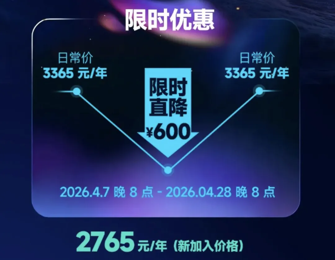 新用户:2765元/年,目前是年度最低价,比平时便宜600元