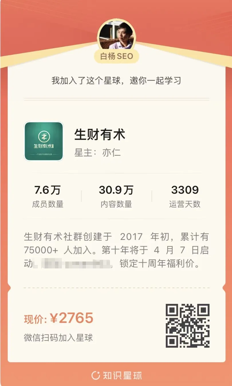 如果是通过白杨SEO的生财有术邀请二维码扫码加入,加白杨SEO微信baiyang2047,凭加入后昵称可以获得返现200(注:因为星球规则,三天内无理由退款,所以退款没有返现哈。返现是官方返佣后再白杨再返给加入的朋友。)