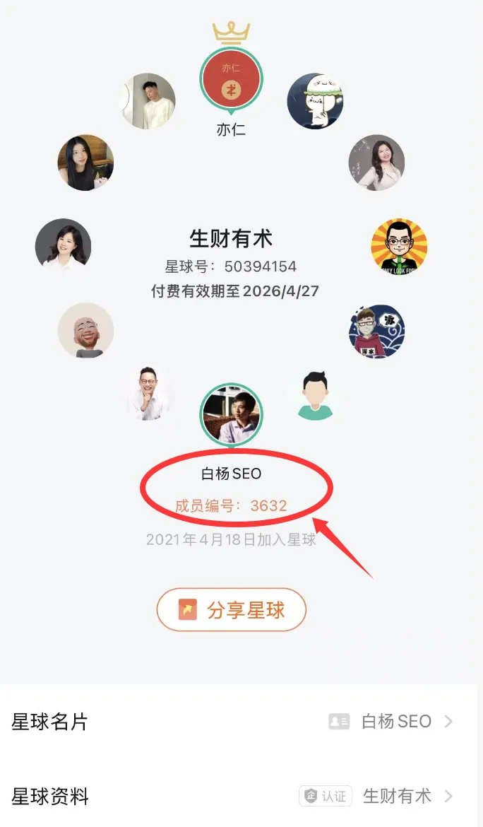 如果你通过我的分享加入了生财,欢迎来找我交流。我在星球里的编号是3632,搜索"白杨SEO"就能找到我。(PS,下面那个时间是星球后面重新计算,我2019年加入的,看编号就知道,嘿嘿)
