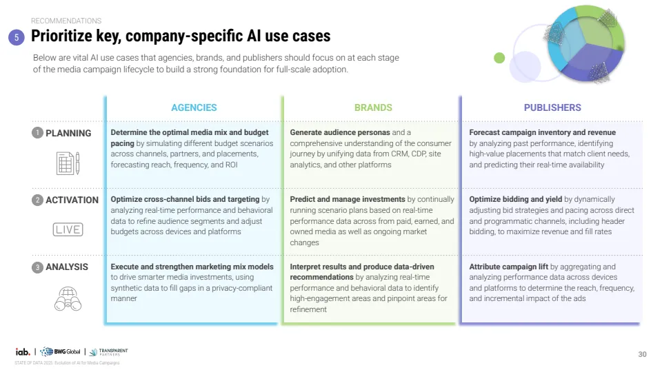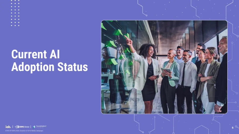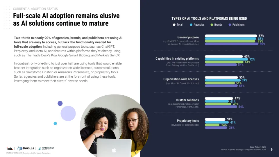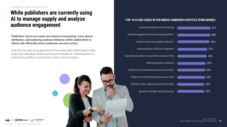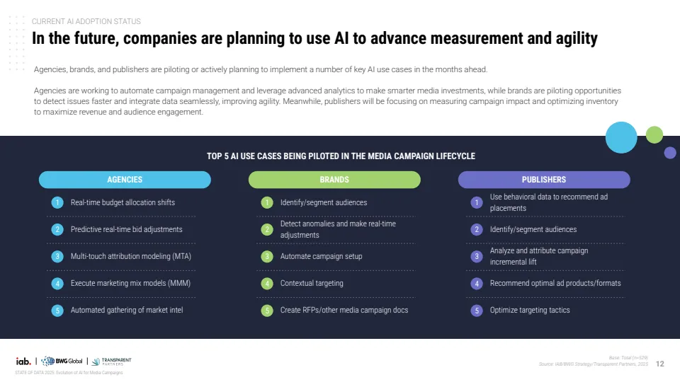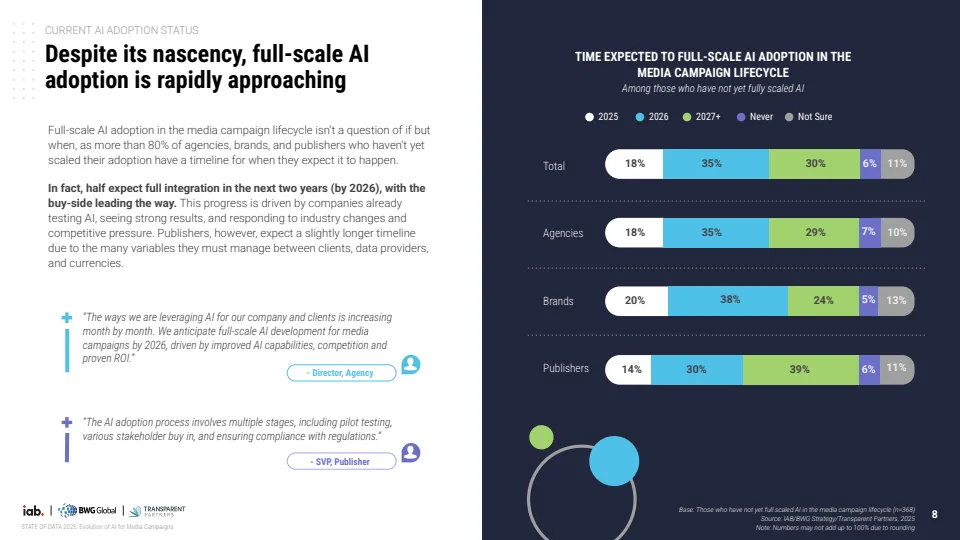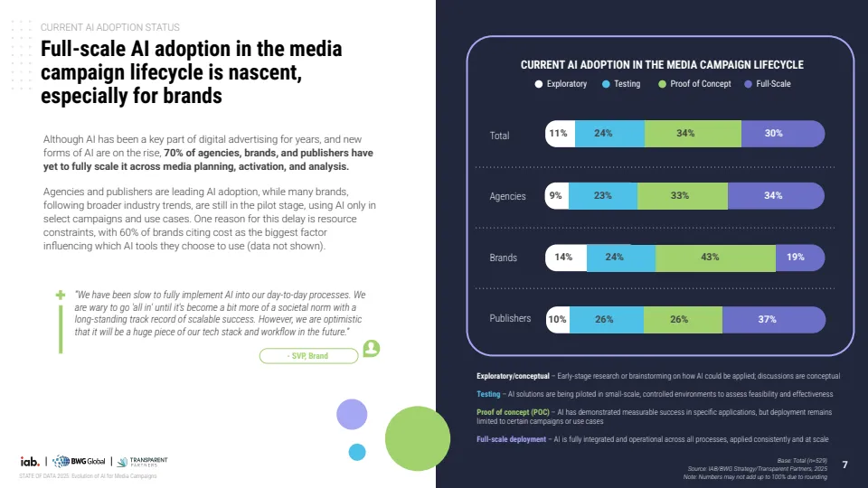 报告基于对529位行业专家调研显示,AI正推动媒体广告进入结构性转型阶段,但整体仍处于早期渗透期。当前约70%的机构尚未在媒体策划、投放与分析全流程实现AI规模化应用,其中仅30%达到全链路部署水平,而品牌侧更为滞后,仅19%实现全面应用,显著低于代理机构的34%与媒体方的37%。