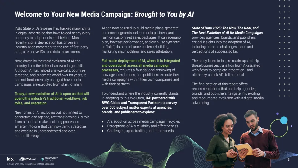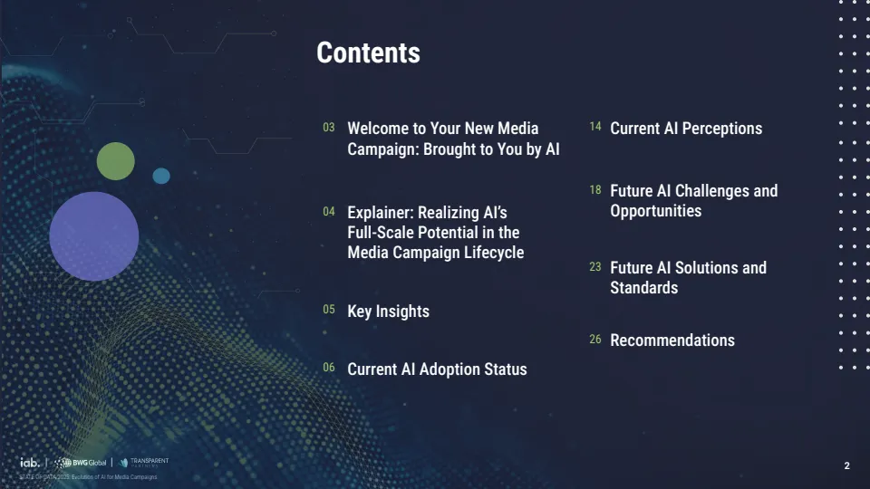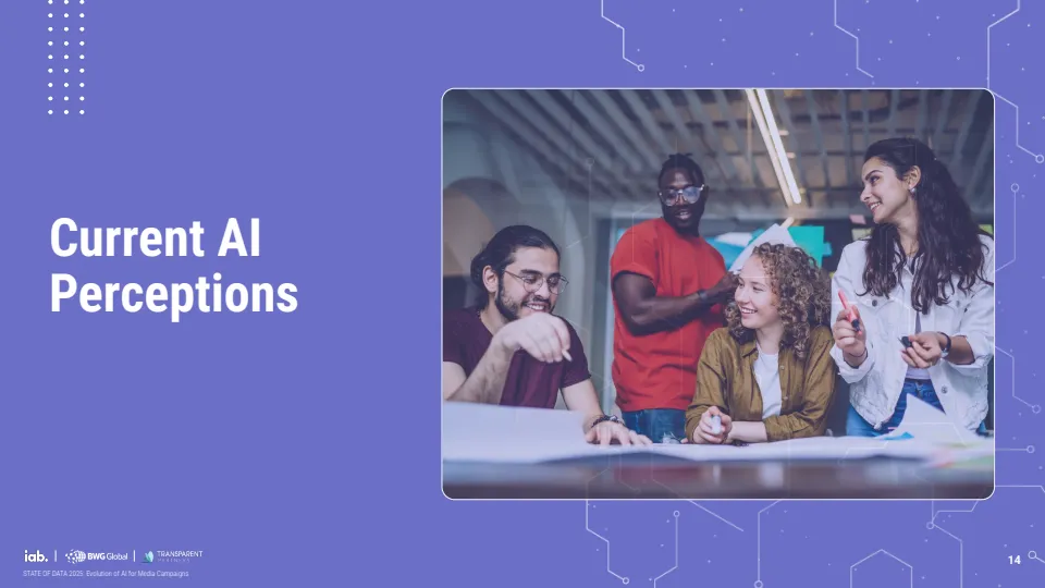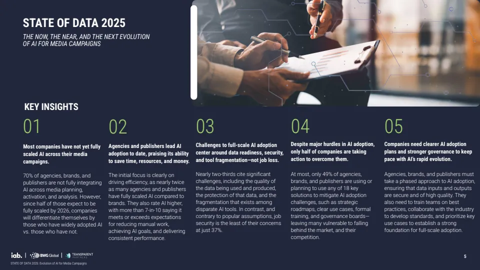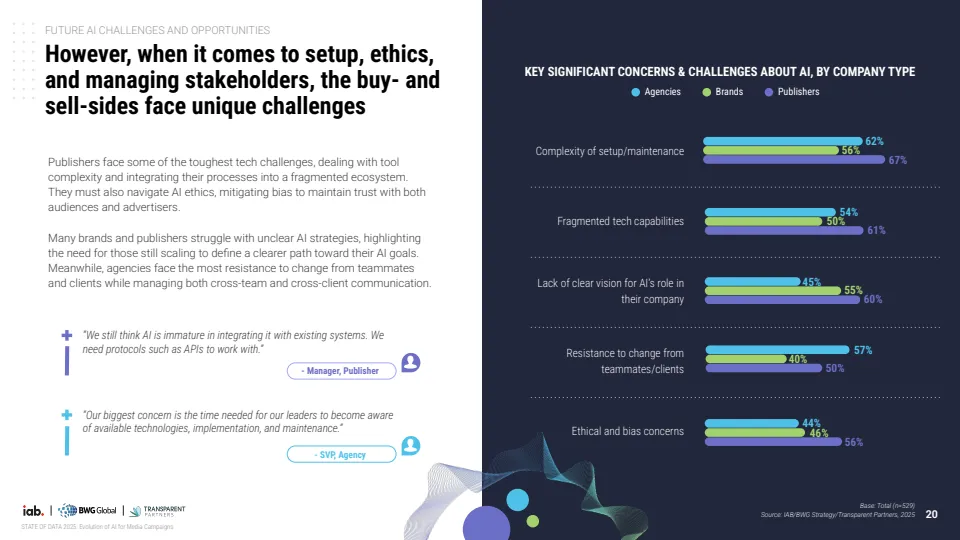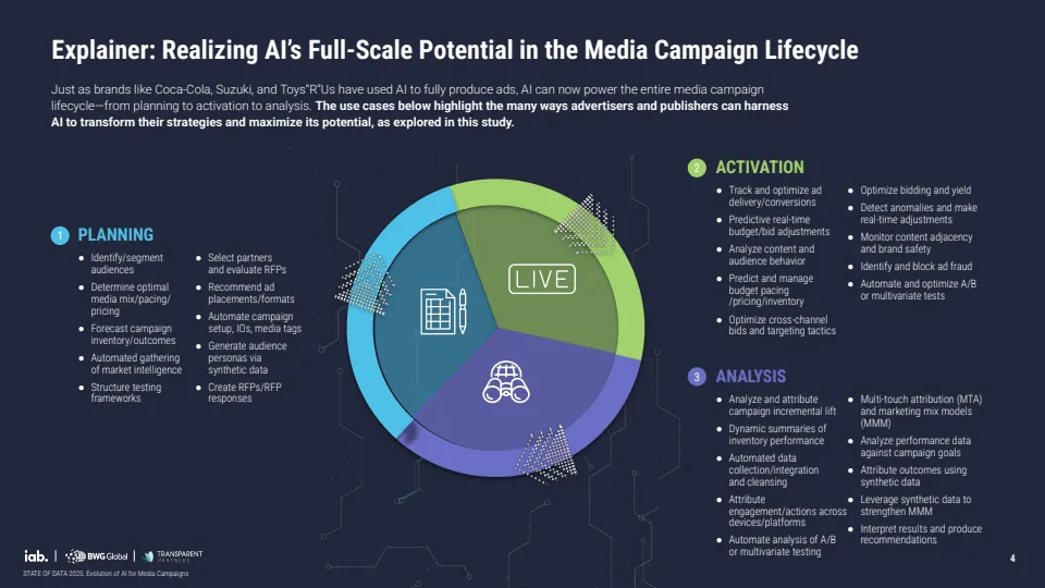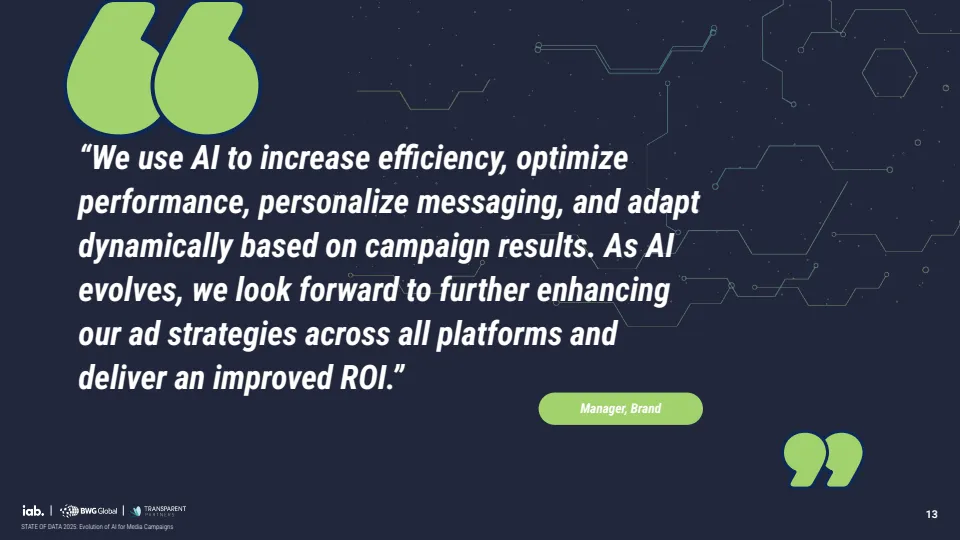 报告基于对529位行业专家调研显示,AI正推动媒体广告进入结构性转型阶段,但整体仍处于早期渗透期。当前约70%的机构尚未在媒体策划、投放与分析全流程实现AI规模化应用,其中仅30%达到全链路部署水平,而品牌侧更为滞后,仅19%实现全面应用,显著低于代理机构的34%与媒体方的37%。