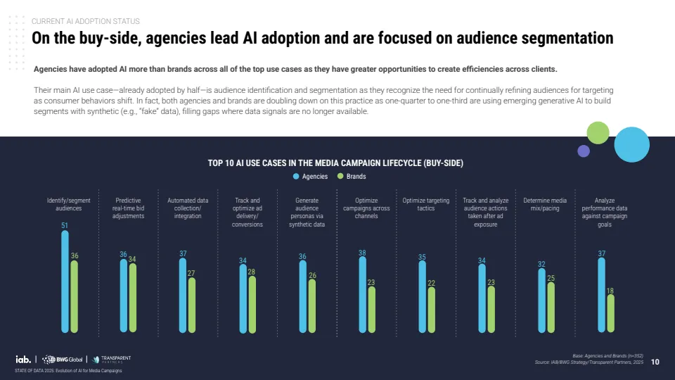 从应用结构来看,当前AI仍集中于“效率导向”场景。85%-90%的企业主要依赖通用工具或现有平台功能,而具备深度整合能力的企业级解决方案使用率仅为34%-55%。这意味着多数企业仍停留在“工具层AI”,尚未进入“系统级AI”。与此同时,代理机构在客户规模驱动下更倾向于应用AI实现规模效率,其核心应用中,受众细分使用率已达51%,远高于品牌侧的36%。