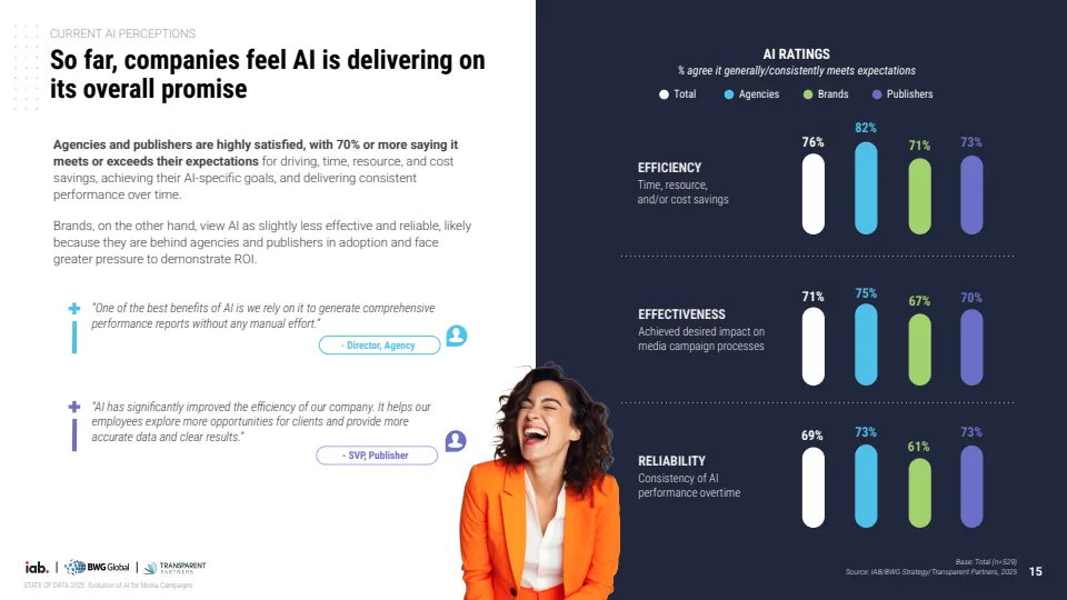 在效果评估层面,AI已初步兑现商业价值。整体来看,82%的企业认可AI在效率提升上的表现,约75%认可其对业务效果的贡献,73%认为其具备稳定性。其中代理与媒体方满意度均超过70%,而品牌侧评价相对保守,仅约67%认可其效果,反映其ROI压力更高。