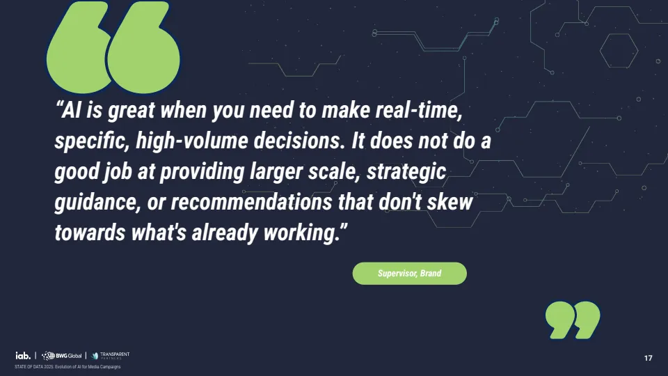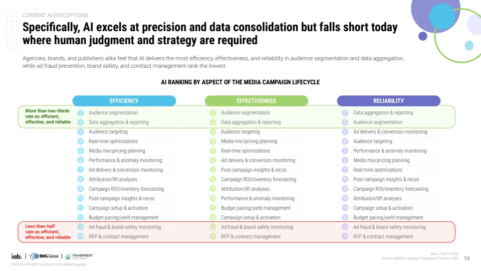 但能力结构呈现明显分化。AI在数据聚合、受众细分等高频、标准化任务中表现最优,超过三分之二企业给予高评价;而在策略制定、品牌安全与合同管理等依赖人类判断的领域,不足半数企业认为其表现可靠。这一差异表明,当前AI更擅长执行与优化,而非战略决策。