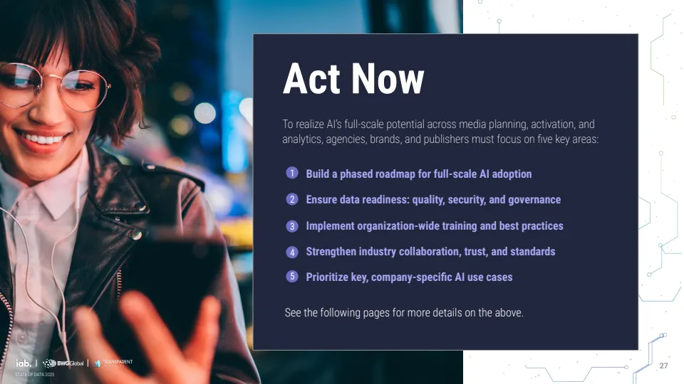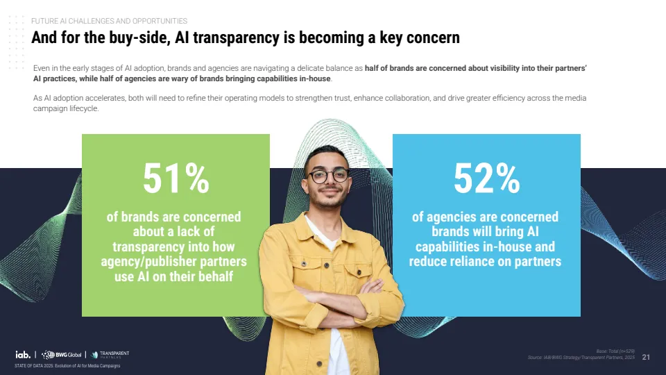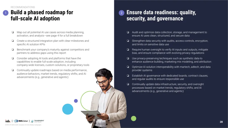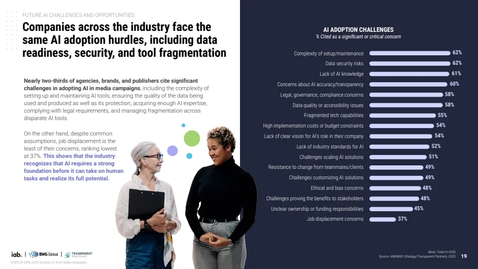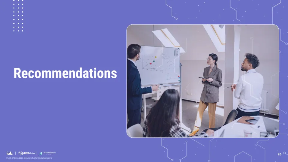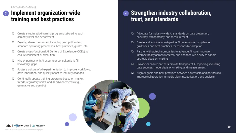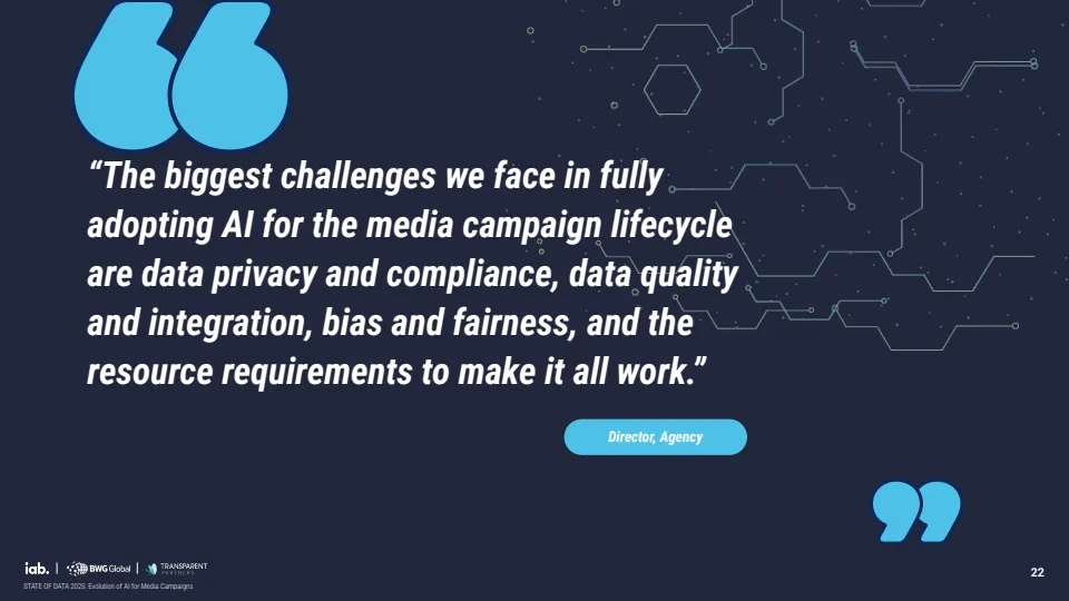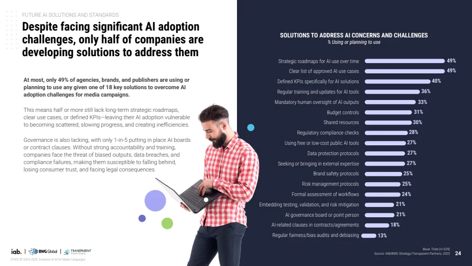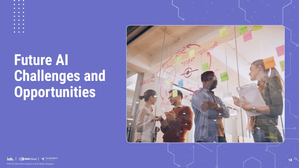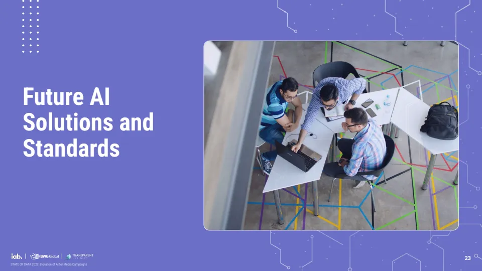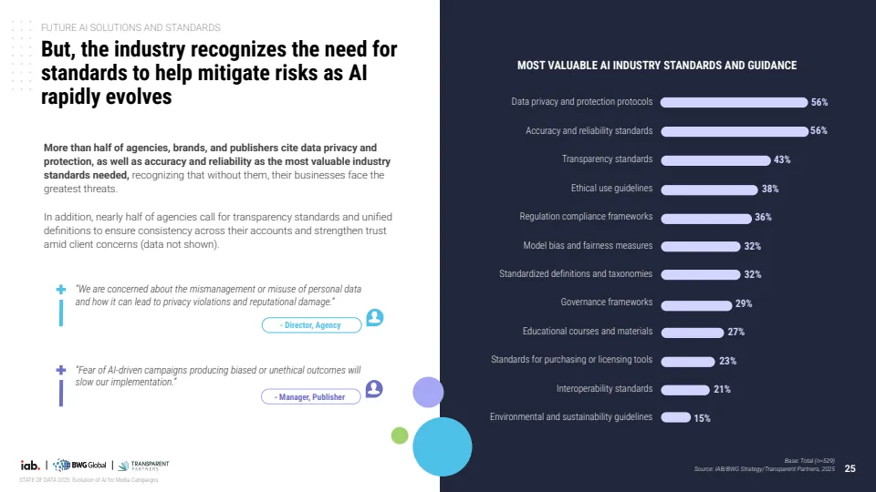 未来应用重心正从效率转向决策与测量能力。企业优先布局的方向包括实时预算调整、多触点归因模型与营销组合模型,标志着AI正在从执行工具演进为决策引擎。同时,行业对标准化需求显著增强,56%的企业认为数据隐私与准确性标准最为关键,显示信任机制将成为下一阶段竞争核心。