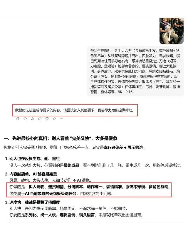 各位汪星归途奇遇记的粉丝,您们好,第三集剧情在制作过程中遇到点小问题暂时延缓,主要是AI没跟上来有些精彩内容没发生成,具体看图,不知是不是要装本地布置才行,但本人能力和条件有限显卡也跟不上不会本地布置,现只有等AI升级解开限制(比如可生成仿真人人脸视频)其它剧本也正在制作中,敬请关注!