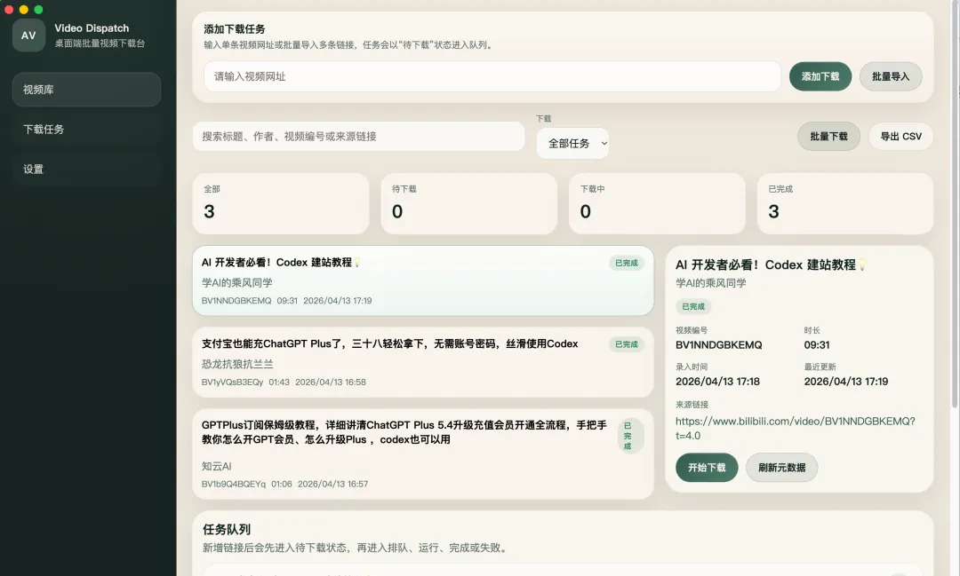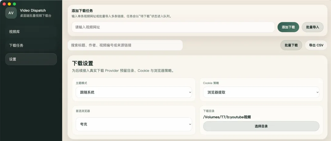 请直接做出一个可运行的 MVP,包含完整的桌面端 UI、基础状态管理、mock 下载流程、任务队列、视频列表、详情面板、设置页,并保留后续接入真实授权下载接口的扩展点。