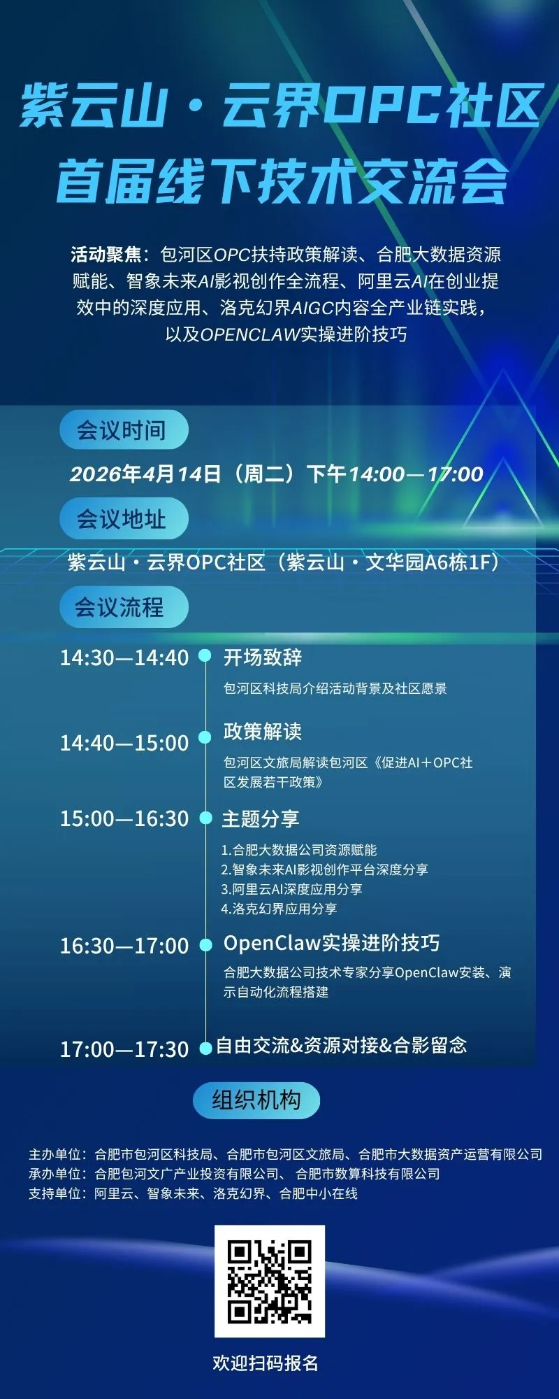 本次活动免费开放,限额50人,面向合肥地区OPC创业者、独立开发者、AI技术爱好者及副业探索者。扫描下方二维码加入活动交流群,即可获取报名入口,先报先得,额满即止。