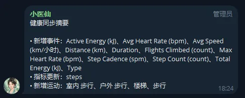 我最近很喜欢的一点是,它还能把同步摘要主动推送到你接入的 Channel 里。你不一定非得先打开飞书表,再去看今天有没有更新,它会把这次新增了什么指标、步数更新到了多少、新增了哪些运动,直接推过来。