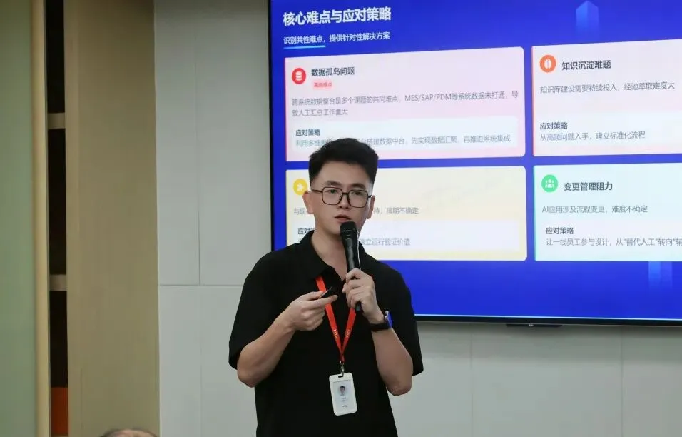 自首期集训落幕,学员们立足各自场景提交27个AI应用课题,最终44名学员进入本次共创环节。为确保研讨精准高效,现场按场景划分为【预测预防】【计划排产】【数据自动化】【知识管理】【质量检测】【决策辅助】六大专项小组,围绕制造应用场景开展交流。