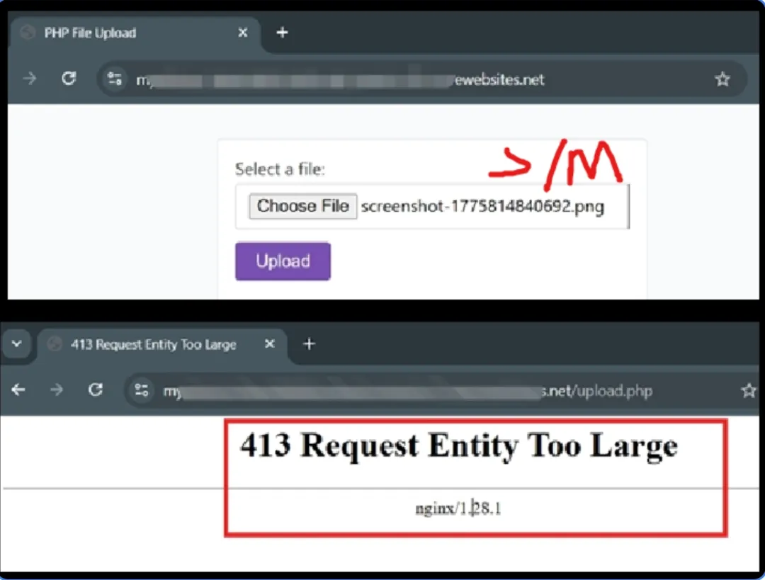 在使用 Azure App Service(Linux + PHP) 部署 Web 应用时,如果上传文件大于1MB,就会遇到 HTTP 413(Request Entity Too Large) 错误。
