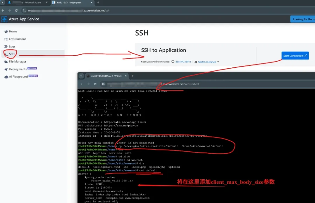 进入kudu,选择SSH到Application, 执行cp命令 cp /etc/nginx/sites-available/default /home/site/wwwroot/default