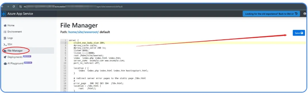 在Kudu页面的File Manager中,进入home/site/wwwroot目录中,选择default文件,直接UI上添加(client_max_body_size 20M;)后保存。