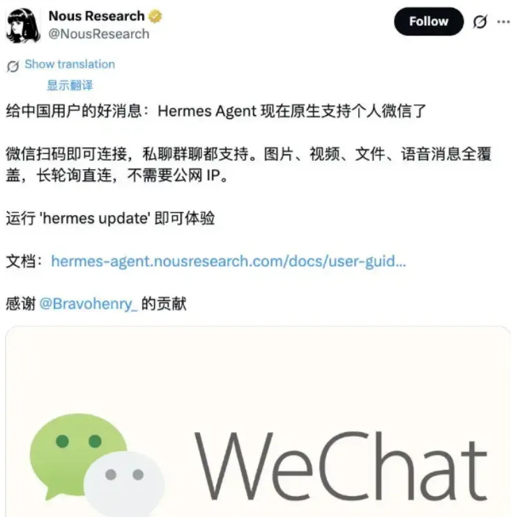 有人在cocoloop社区里发了一段话,大概意思是,Hermes的作者太nice了,不仅主动跟国内模型做了适配,之前有人提交的逆向微信接入,前天就并入版本了。