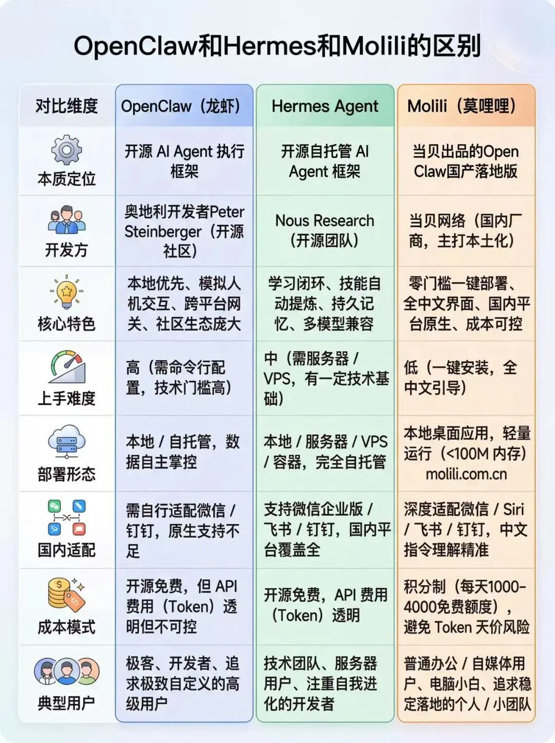 我们现在目睹的这一切,OpenClaw的爆火和口碑崩塌,Hermes的快速崛起,国产Agent(如当贝Molili、腾讯QClaw、阿里JVSClaw)的厚积薄发,它们放在一起构成了一个信号,就是AI工具的更迭速度,已经不再是按年计算了。