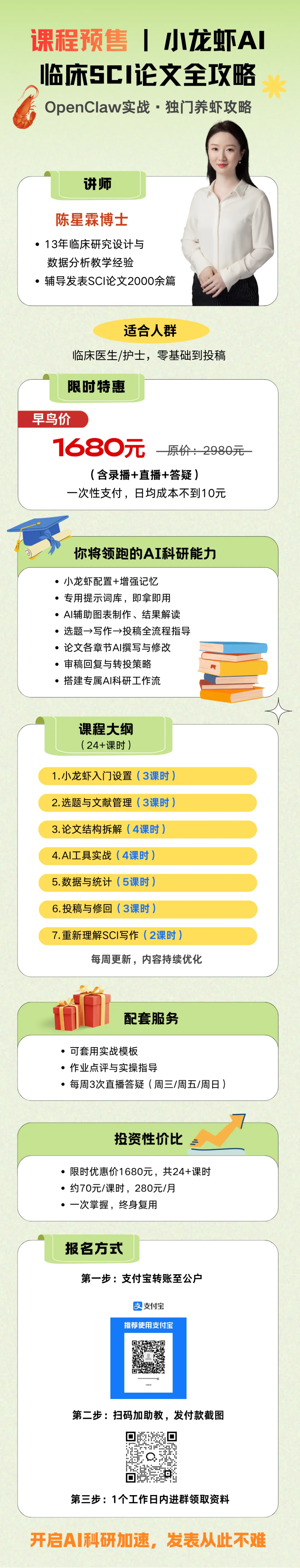 陈老师独门养虾课程预售,未来的半年,加入小龙虾AI辅助临床研究SCI论文撰写社群,享第一批独门课程学习优选权,平均每天不到10元的投入,让你收获满满。