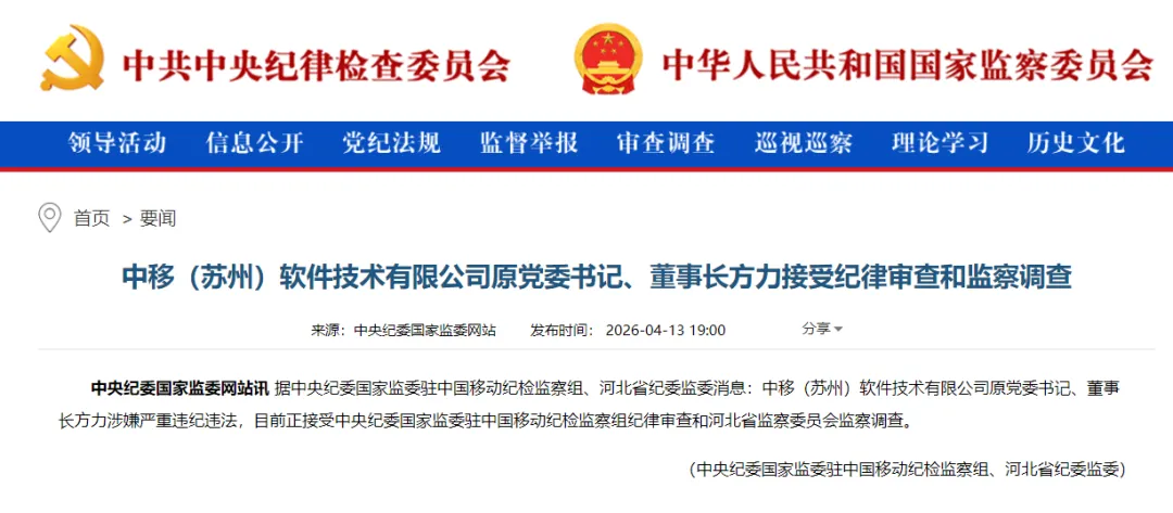 中央纪委国家监委网站讯据中央纪委国家监委驻中国移动纪检监察组、河北省纪委监委消息:中移(苏州)软件技术有限公司原党委书记、董事长方力涉嫌严重违纪违法,目前正接受中央纪委国家监委驻中国移动纪检监察组纪律审查和河北省监察委员会监察调查。