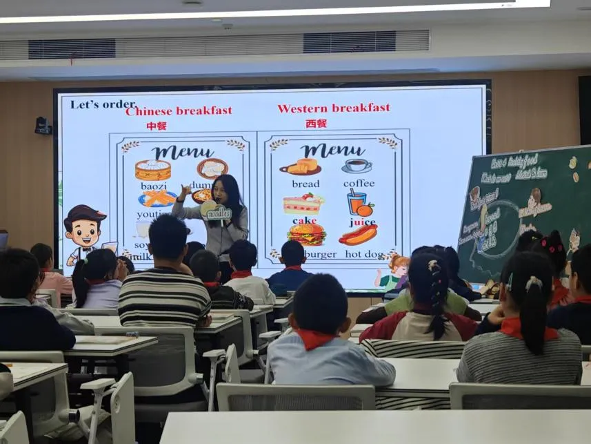 首先,周丹老师执教三年级下册英语《Unit 4 Healthy Food A Let's talk&Let's learn》。课堂以英文歌曲热身导入,借助早餐实物互动开启教学,将早餐类词汇、核心句型融入真实情境,通过“滚雪球”游戏、角色扮演等趣味活动夯实知识。课堂还融入中国面食文化及各地早餐差异的拓展内容,最终升华健康饮食主题,实现了情境教学、语言运用与文化德育的有机融合。