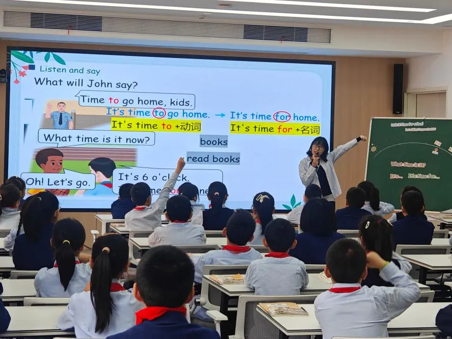 马雨薇老师执教四年级下册英语《Unit 3 Time for school B Let’s talk & Let's learn》。她以时间表达与日常安排为核心,创设贴近生活的学习情境,带领学生分析Amy、Zhang Peng、John三位主人公的时间表,帮助学生在真实情境中理解并运用时间相关词汇与句型。课堂活动丰富、互动高效,学生在轻松氛围中扎实掌握语言知识。课堂结尾升华主题,引导学生学会合理规划、科学管理时间,养成珍惜时间的好习惯,实现语言学习与习惯培养的有机统一。