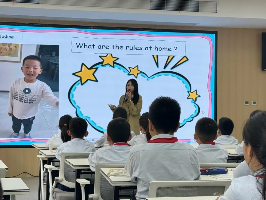 赵李慧老师执教四年级下册英语《Unit 2 Family Rules》读写课。课堂以学生真实的家庭规则视频导入,并借助AI技术辅助教学。她先指导学生深入阅读文章、完成理解任务,进而引导学生在具体情境任务中尝试创写不同场所的规则。在此过程中,学生潜移默化地接受了德育浸润,自发领悟到遵守规则的意义与益处。