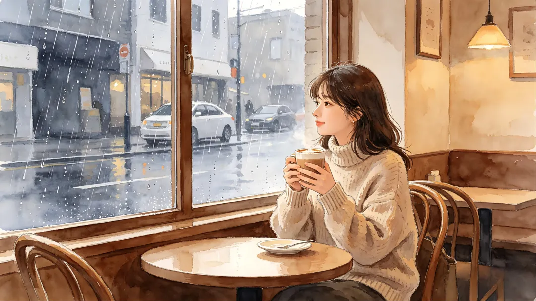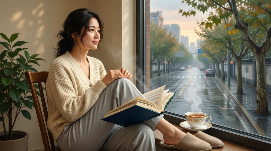 "一个女人穿着睡衣窝在沙发里,捧着热可可,窗外下着雨。"