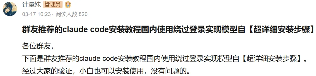 A:稍微麻烦一点,咱们计量社群有一份傻瓜式上手的Claude code安装指南,已经被验证过轻易上手。