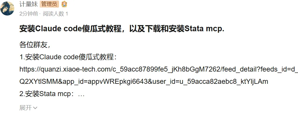 让AI直接跑你的Stata,前件是需要安装个Claude code,但很多群友说装不来,建议通过咱们计量社群那份傻瓜式Claude code安装指南上手,已经被验证过轻易安装成功(视频)。